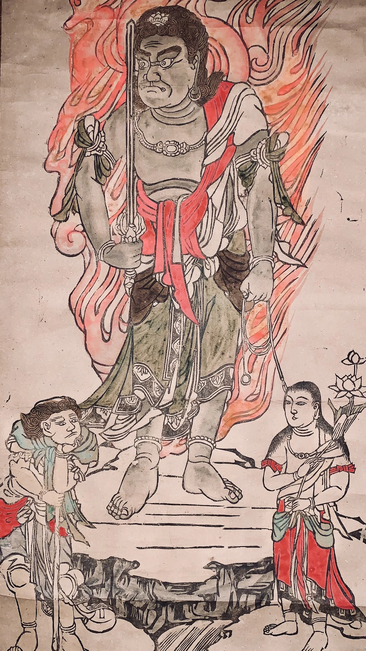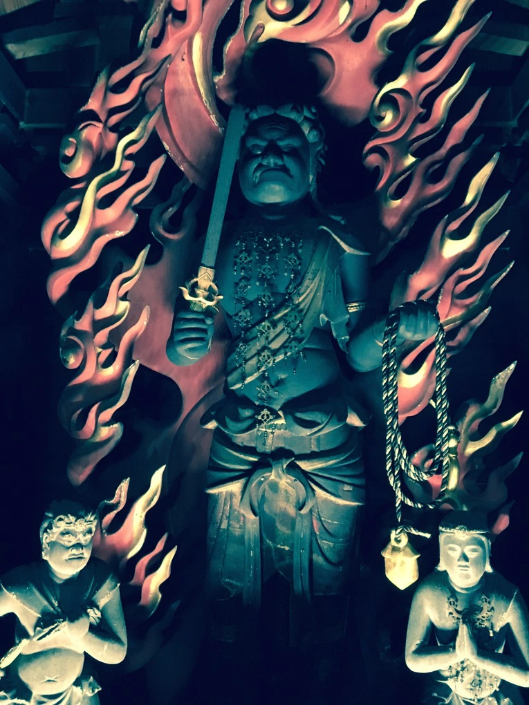 不動明王は、如来や菩薩といった仏様のお姿とは異なり、青黒く憤怒の表情、さらに火焔を背負っておられます。