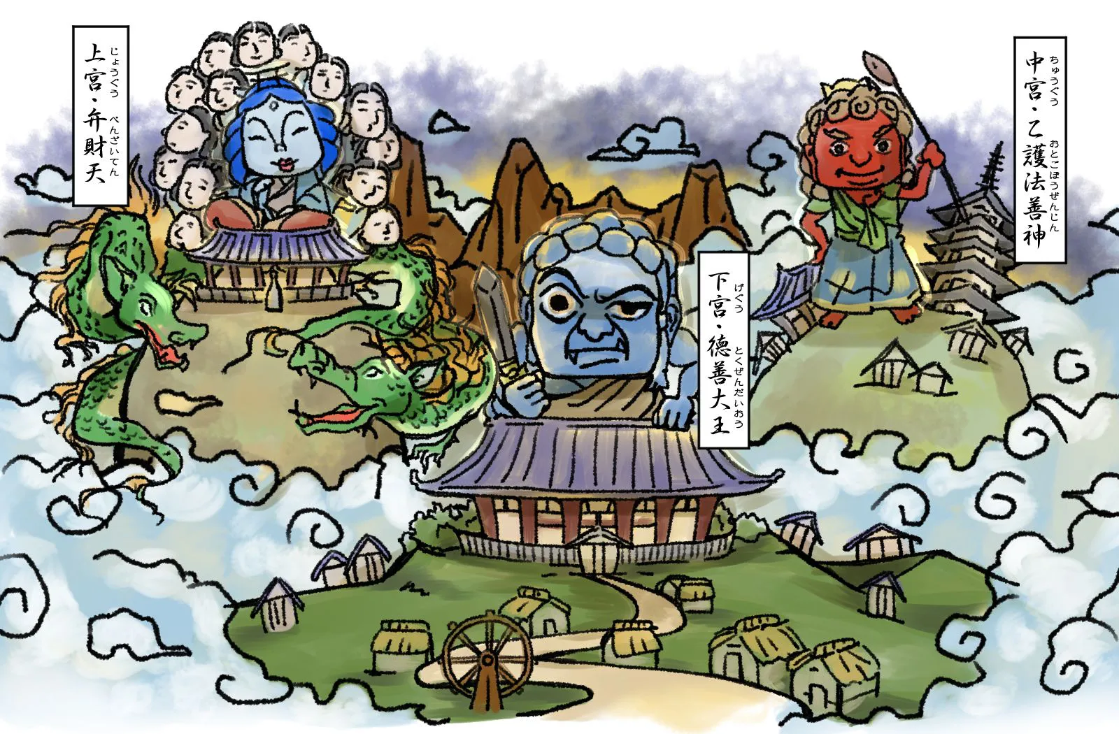 かつて背振一山を構成した上宮・中宮・下宮の三箇所に【辨財天(べざいてん)】【乙護法善神(おとごほうぜんじん)】【徳善大王(とくぜんだいおう)】がそれぞれお祀りされています。