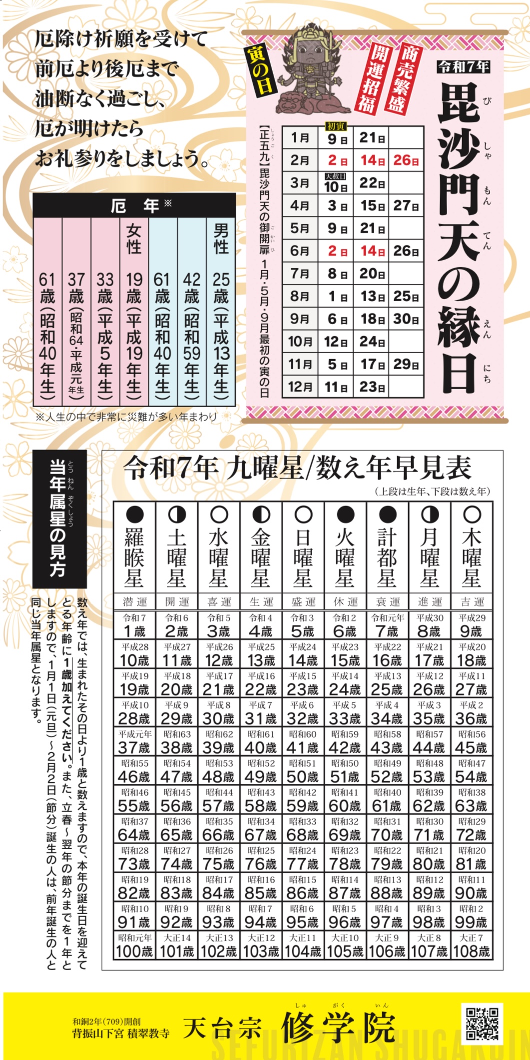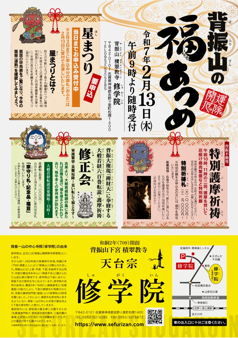 七難即滅・七福即生と経文にありますように、災い転じて福となることを願い『福あつめ』と称して、併せて開運招福の【星まつり】、修学院の本尊に厄除け・商売繁昌などを祈願する【特別護摩祈祷】も行います。